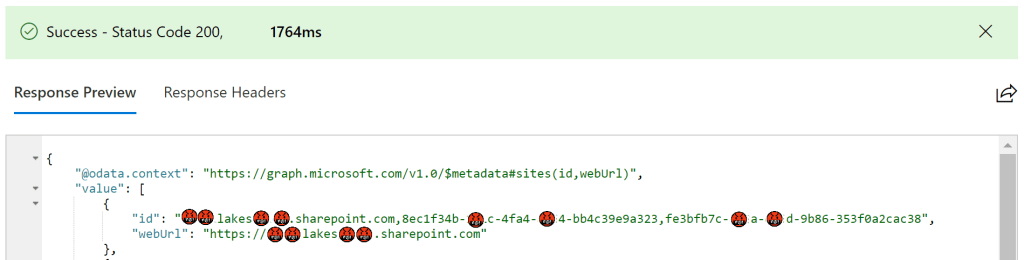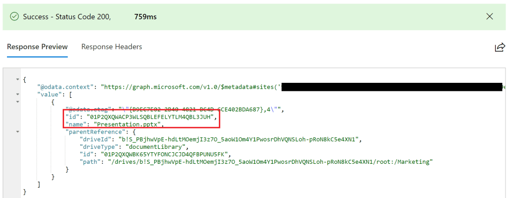 Site ID acquired! Now, you’ll need the IDs of the source and target document libraries. Why? To get the IDs for the “Marketing” and “Human Resources” folders. Reminder, check out Microsoft’s documentation.
