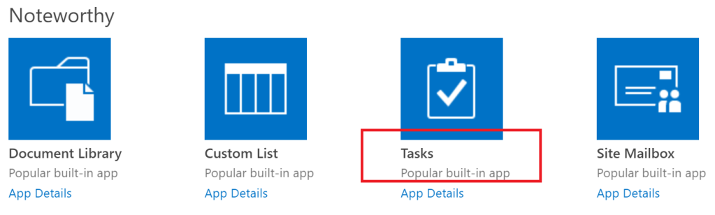 My next screen lists several app types. Document Library and Custom List are arguably the most popular, but I want a Tasks app. I would need to create all of the columns from scratch if I chose Custom List. However, the Tasks app will do most of the work for me… And again, I’m naming my new app Tickets.