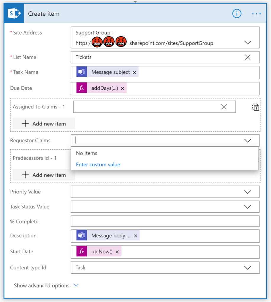 Step #2: I accept the parameters from the previous step and create a Task list item in SharePoint Online…