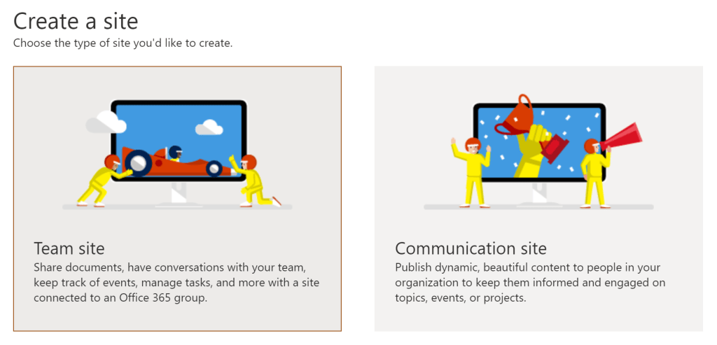 Because I’m going to use SharePoint Online, I need a new SPO site. My template of choice is the Team site. Why? Because I want the generated Office group that’s created in the background. The Communication sites are not associated with Office groups.