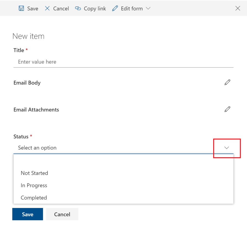 Now to assign list item values! Message subject from the post in Teams is set to the Title field and Email Body will be assigned the Message body. But Email Attachments will be the listOfAttachments variable. Lastly, the default Status is set to Not Started: