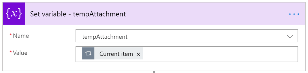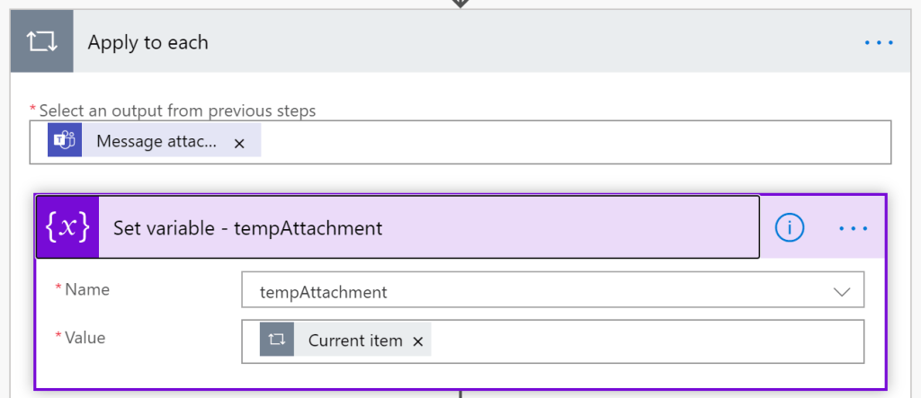 Moving on, the Flow has a trigger and four variables have been initialized. Next up is processing the Message attachments. Add an action to loop through each attachment:
