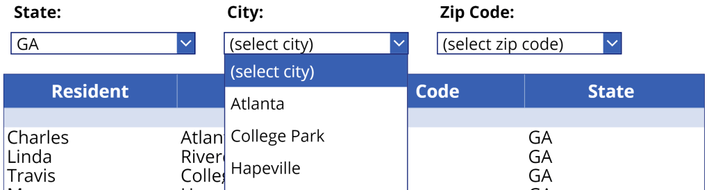 The selected state would have filtered the city dropdown and the resident table. The next batch of formulas are added to the OnChange property of ddlCity: