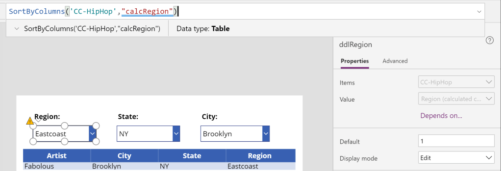 The first dropdown is ddlRegion. Again, the Region choice column won’t be an available option. Instead, use the calculated column: