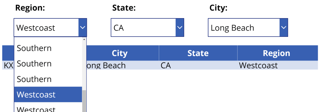 The OOB solution doesn’t limit the dropdown options to unique values. And using the Distinct() function produces an error. Because of this, the dynamic selections are one-to-one for each dropdown, not one-to-many…