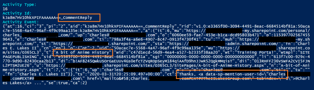 Write-Host -F White "$($i.ActivityEvent)`n`n"