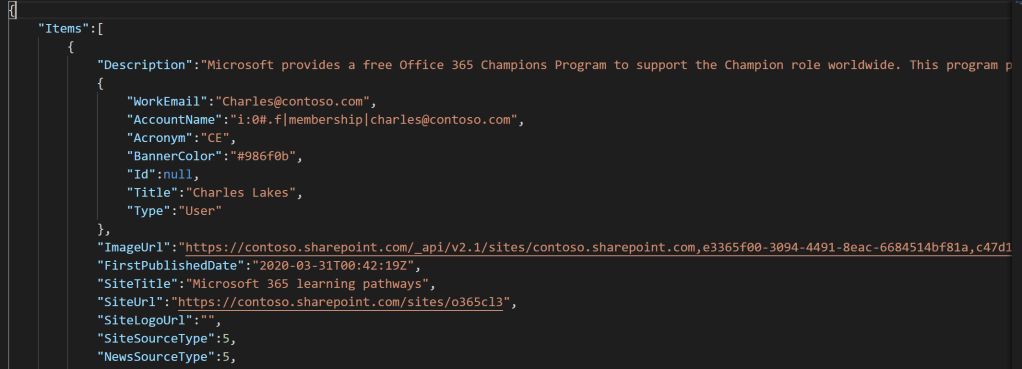 This value array lists [SharePoint Online] news post objects with its own notable key-value pairs. Title is the headline and Description the body, but the nested Site object references the source SPO site: