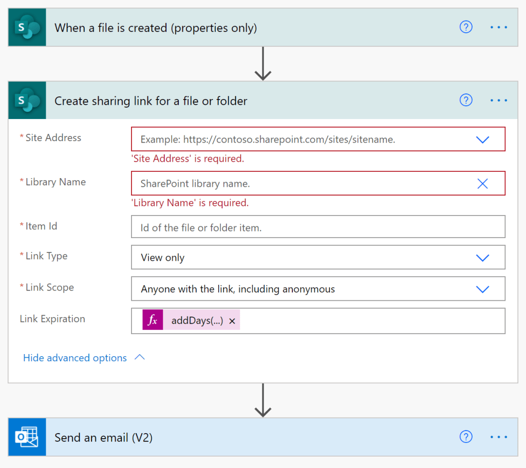 Someone asked me about anonymous sharing with expiring links. Although this could be configured at the tenant level, it isn’t always set. As a workaround, how about a workflow to share a file, notify the recipient, then terminate the share?