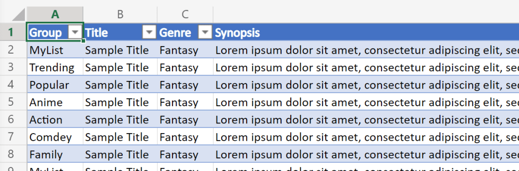 - E.g., Group; Title; Genre; Synopsis; Image.