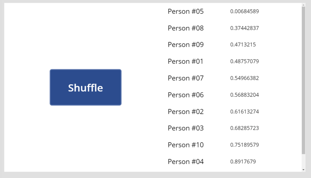 Moving onto the button’s OnSelect() action, clear the temp collection, then re-add the raffle names and assign each with a random decimal, between 0 and 1, as their Order value: