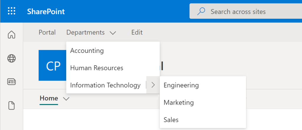Conversely, with the modern approach, Departments doesn’t need to be created as a sub-site. Instead, just create the company Portal as a site collection, then create each department as their own site collections: