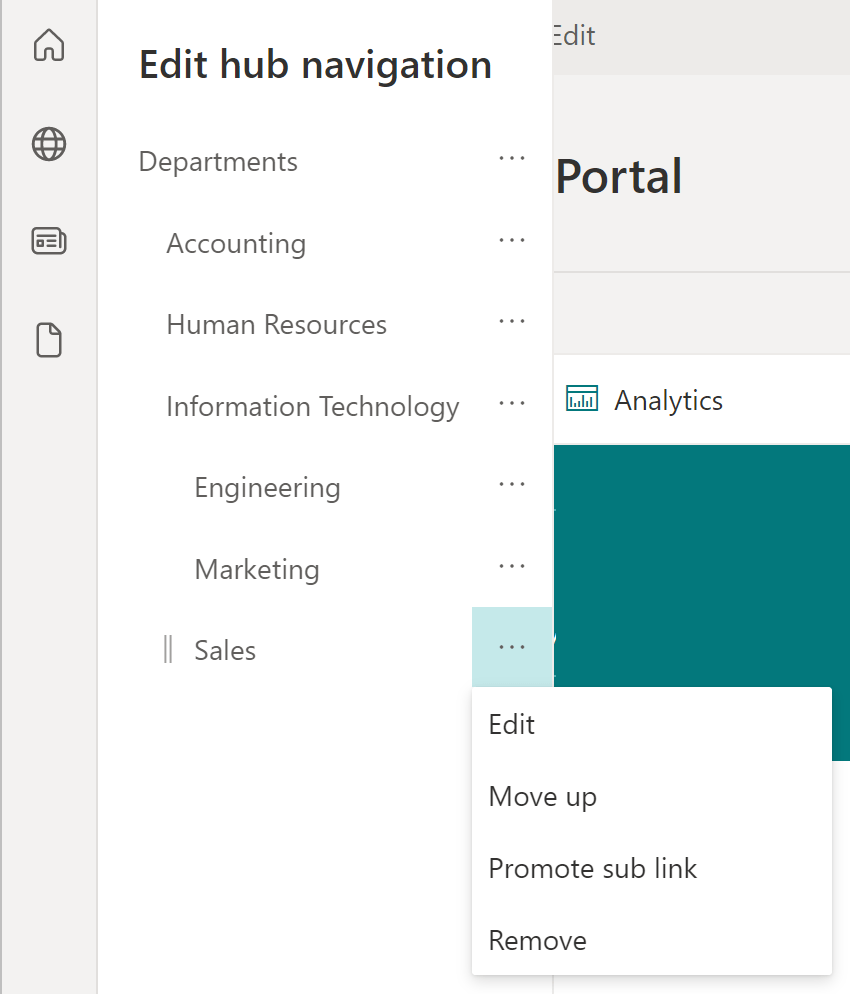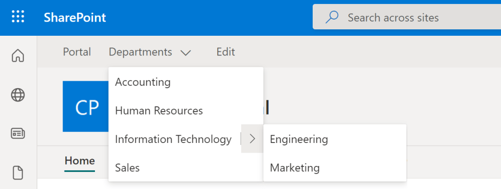 Another difference in this approach, Departments and Information Technology are created as navigation labels, not sites. And Sales is presented as its own department site with one click. No scheduled migrations, no broken links, and no parent-site dependencies, just Promote sub link: