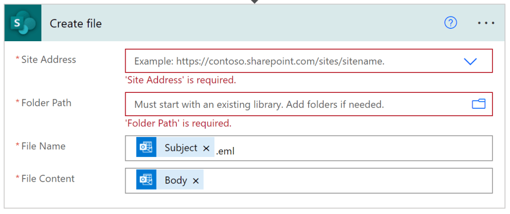 Finally, the Create file action requires just four parameters. Specify the target SPO site and target library, then provide the file a name and supply the file Body: