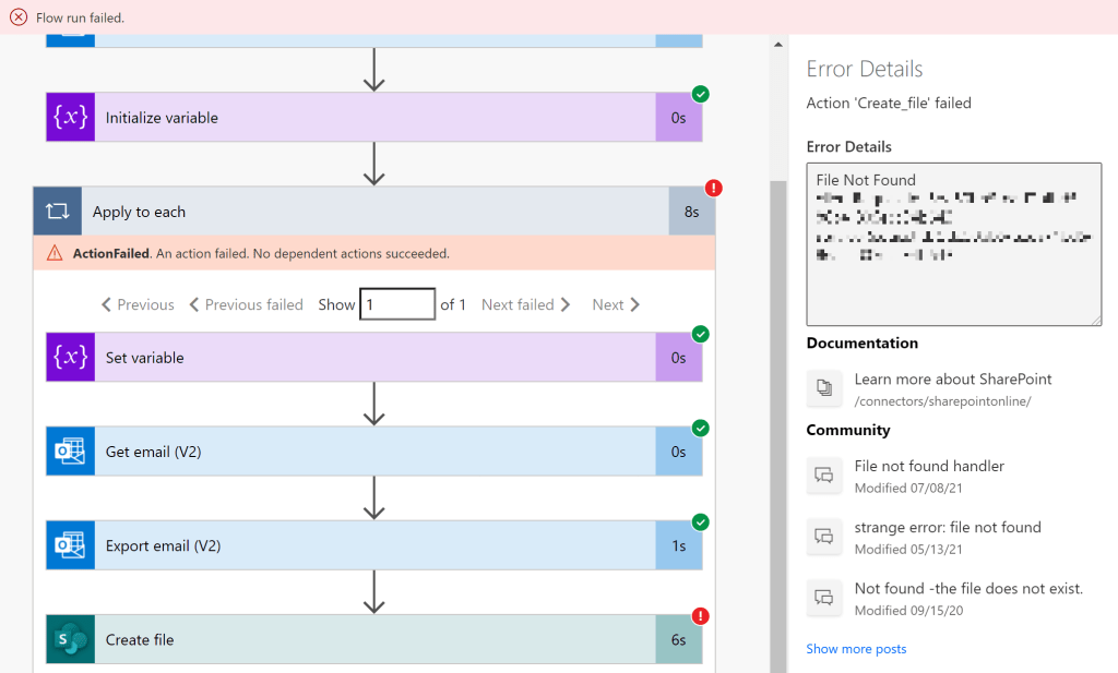 Now, to copy a file to SPO, the file is actually created as a new file. To create these new files, the flow needs the content of each file. Export email gets the email body for the creation step: