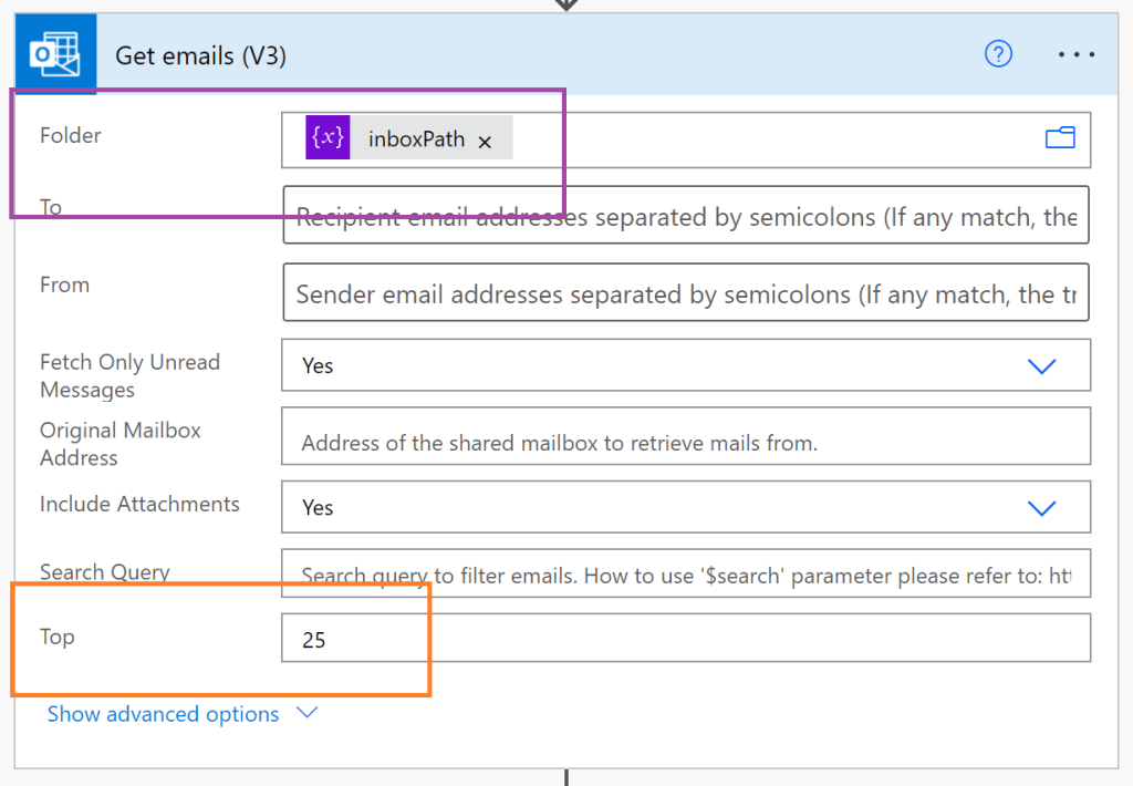 FYI: The Outlook Get emails action can only return 25 messages at a time. For larger directories, use the Delete email action to purge already copied emails, then target the path again.