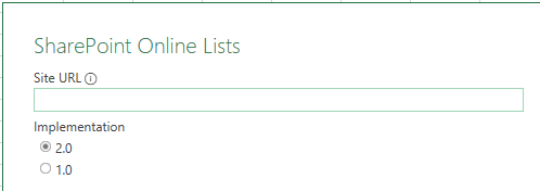 Copy and paste the SharePoint Site URL, toggle Implementation to 2.0, then click OK: