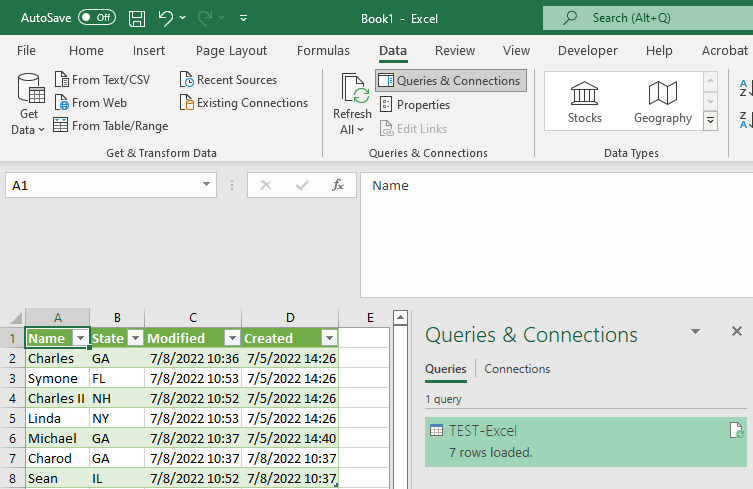 Finally, with the List items imported, Excel creates a connection to the source data. This connection, listed under the Queries & Connections pane, will be named after the SPO list and binds Excel to SharePoint: