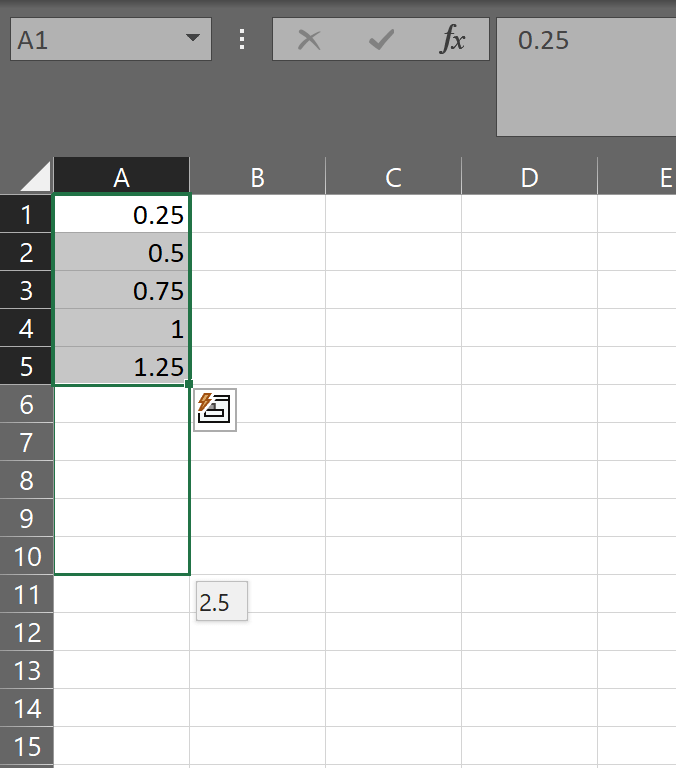 Instead, use Microsoft Excel to populate the range. Start entering the first few values, to establish the pattern, then use the Fill Series feature to complete things. Copy and paste these values into the Forms‘ option box: