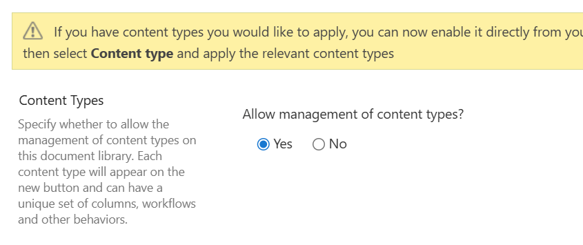 Now, before tweaking the JSON snippet, open the document library’s Advanced settings and toggle “Allow management of content types” to yes. Otherwise, the JSON-to-be won’t recognize the [$ContentType] property: